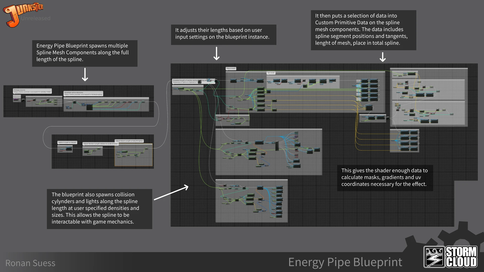 The spline also gets lights and collision objects spawned along its length so there is no additional setup for the energy pipe blueprints. Drag them in and you are ready to go.